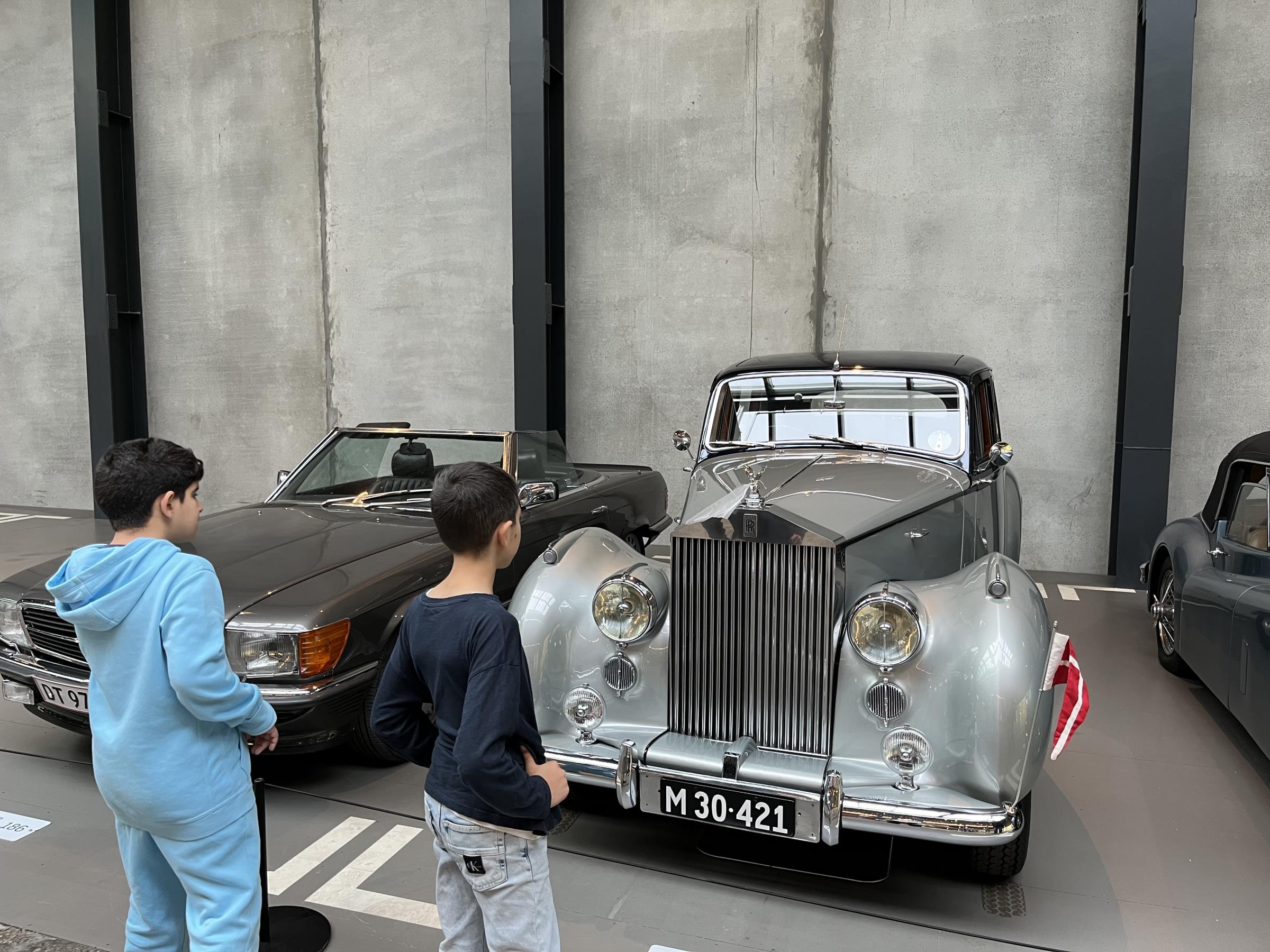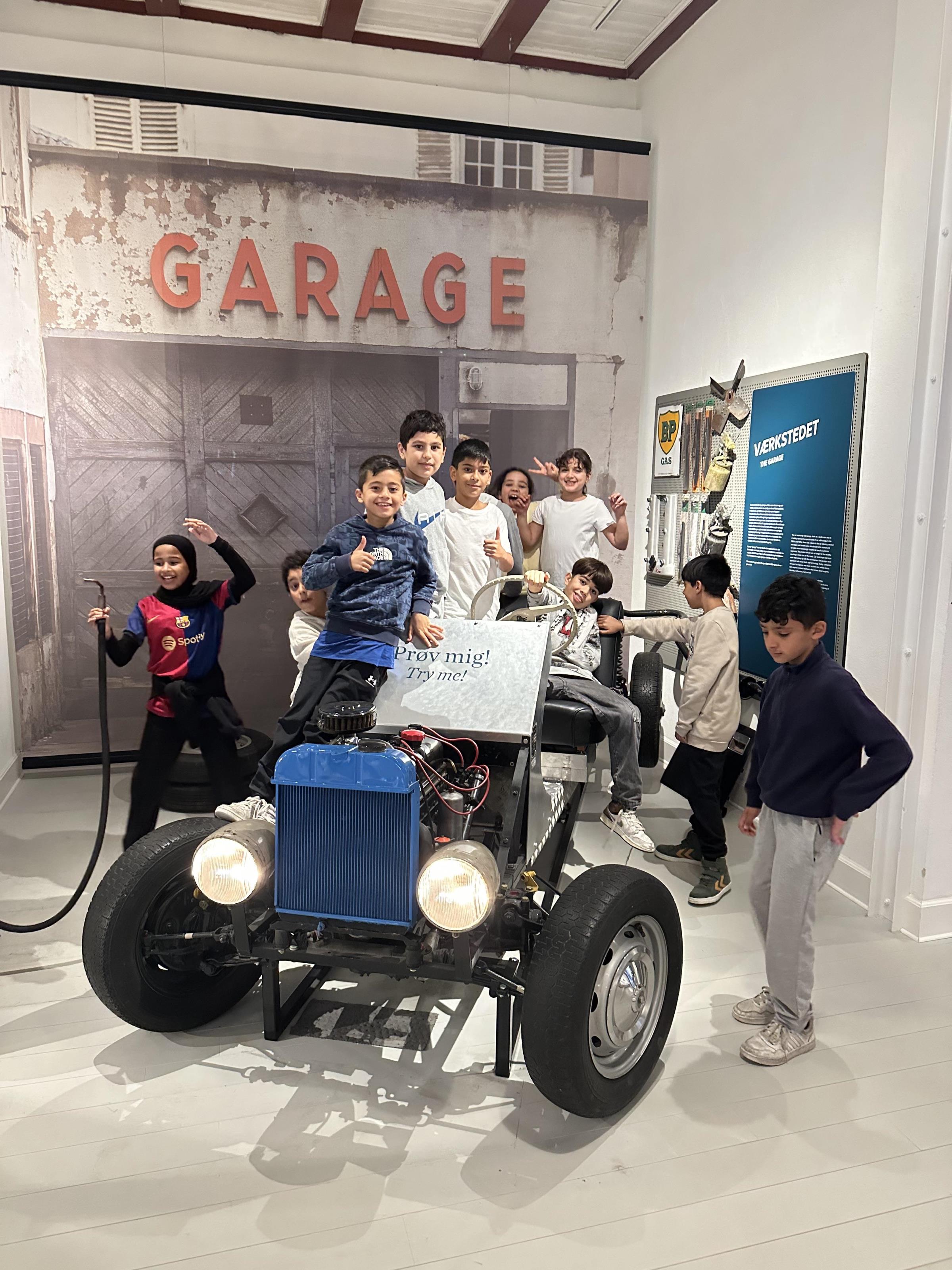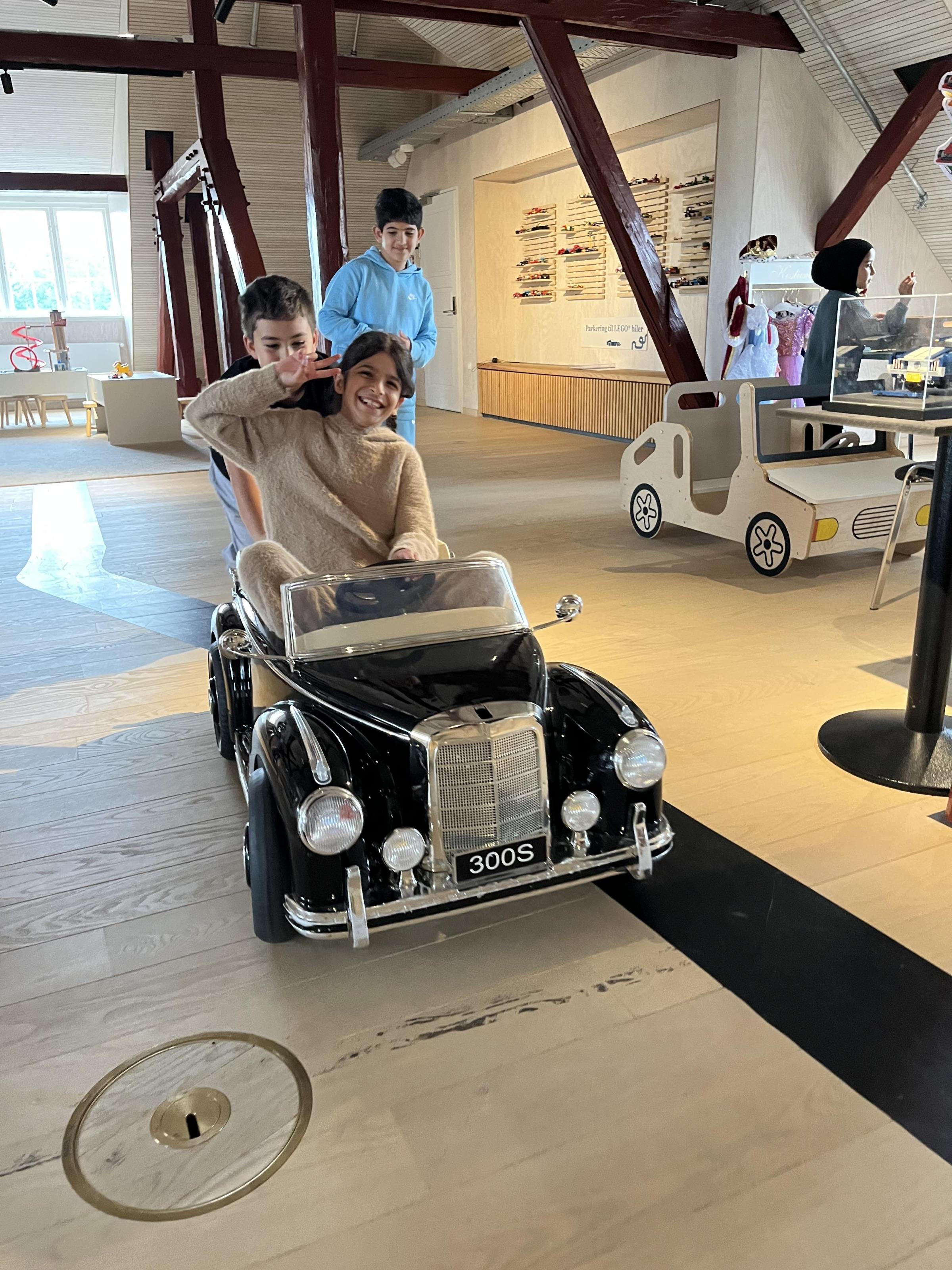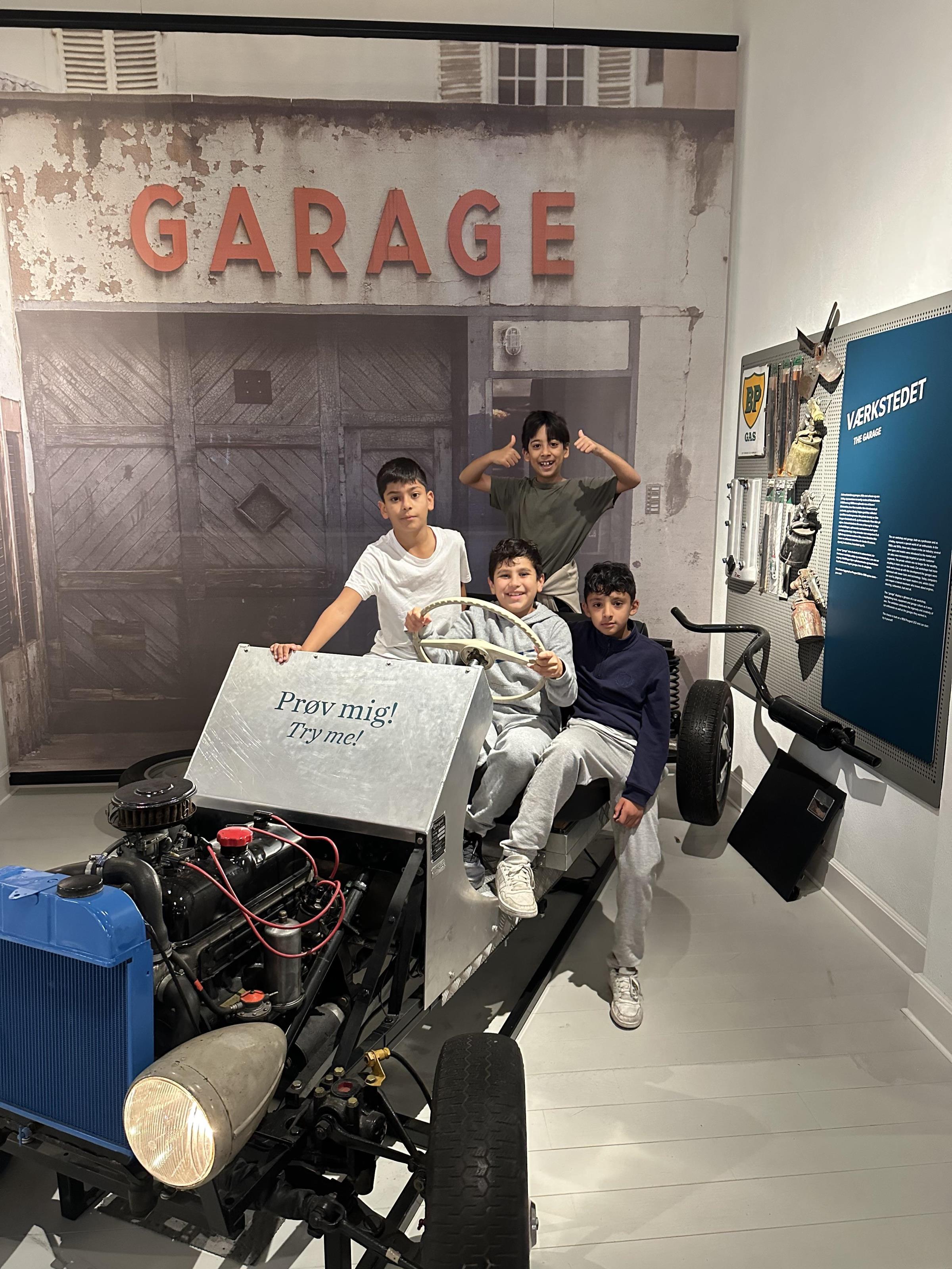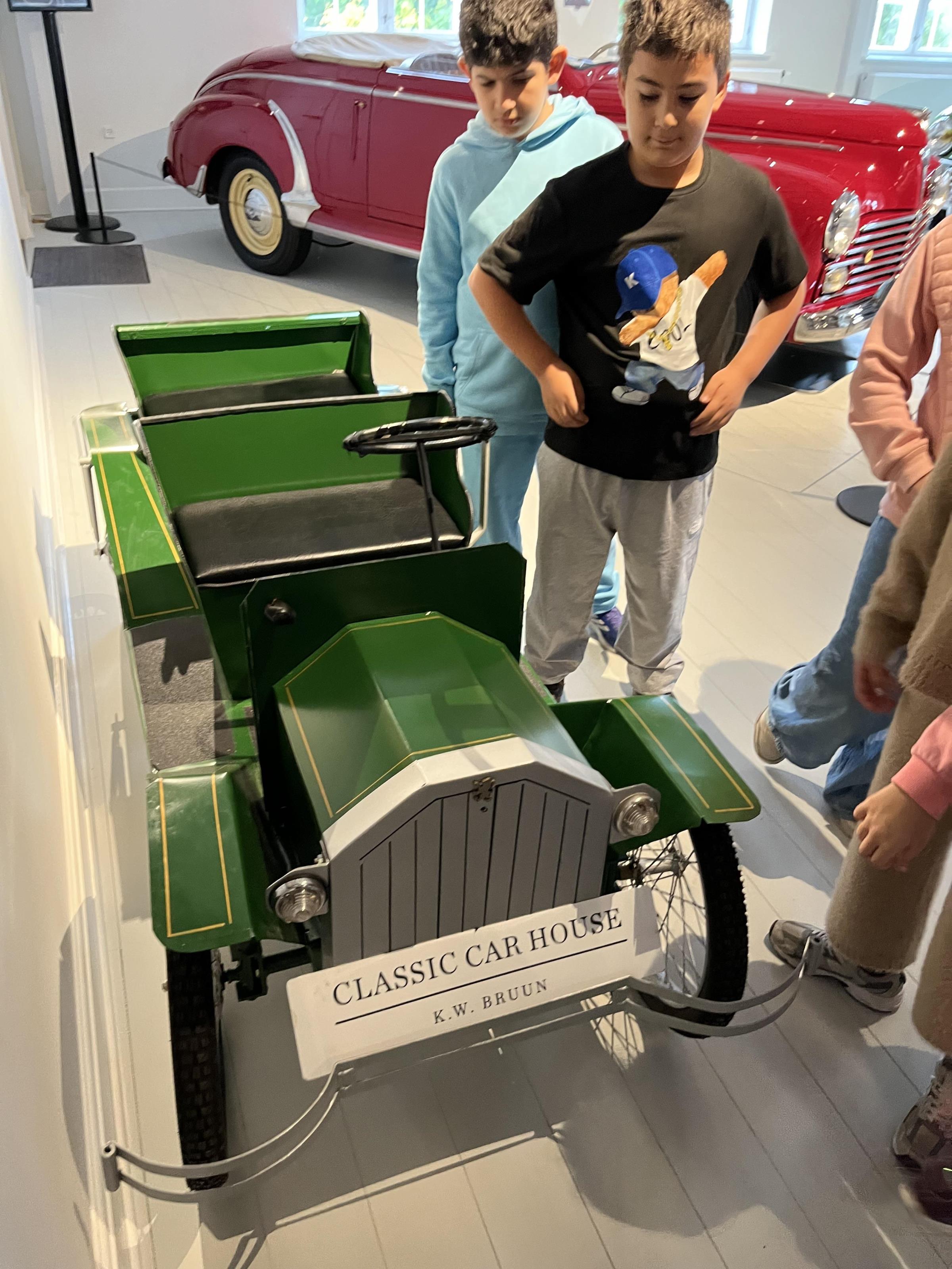 Vi var taget helt til Lyngby for at se på biler. Bilmuseet var fyldt med de skønneste biler fra alle tider, og vi fik til sidst lov til at give den gas uden for på den lille trafiklegeplads, vrooouummm…..!